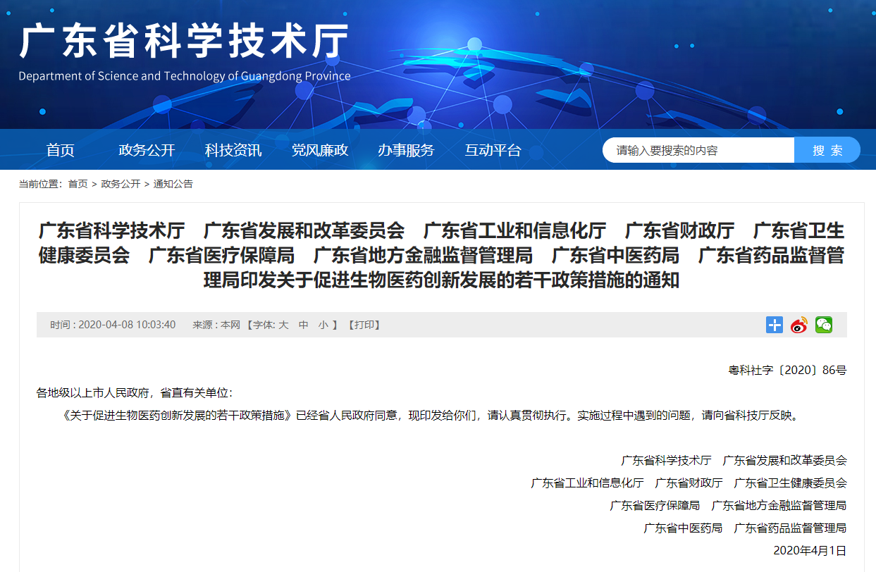 4月8日,广东省科学技术厅、广东省发展和改革委员会、广东省工业和信息化厅、广东省财政厅、广东省卫生健康委员会、广东省医疗保障局、广东省地方金融监督管理局、广东省中医药局、广东省药品监督管理局等多部门联合印发《关于促进生物医药创新发展的若干政策措施》(以下简称《措施》),致力于提升生物医药原始创新能力和国际竞争力,推动生物医药科技和产业高质量发展,提高生物安全治理能力。